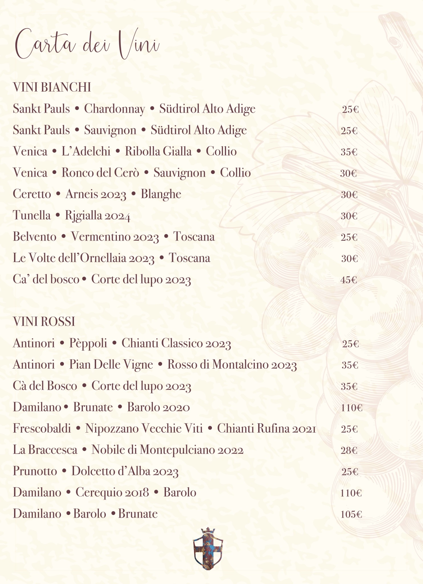Vini rossi: Antinori Peppoli Chianti Classico 2023 (25€), Antinori Pian Delle Vigne Rosso di Montalcino 2023 (35€), Ca’ del Bosco Corte del Lupo 2023 (35€), Damilano Brunate Barolo 2020 (110€), Frescobaldi Nipozzano Vecchie Viti Chianti Rufina 2021 (25€), La Braccesca Nobile di Montepulciano 2022 (28€), Prunotto Dolcetto d’Alba 2023 (25€), Damilano Cerequio 2018 Barolo (110€), Damilano Barolo Brunate (105€).